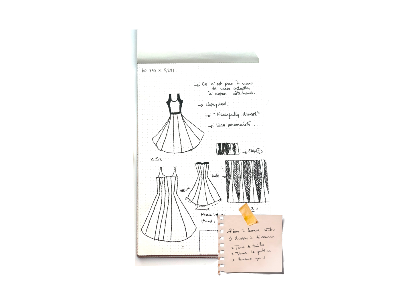 Le défi ici était de repousser les limites de ma créativité, et de voir s’il est possible de Fare une robe issues des techniques couture, en utilisant une matière peu noble.